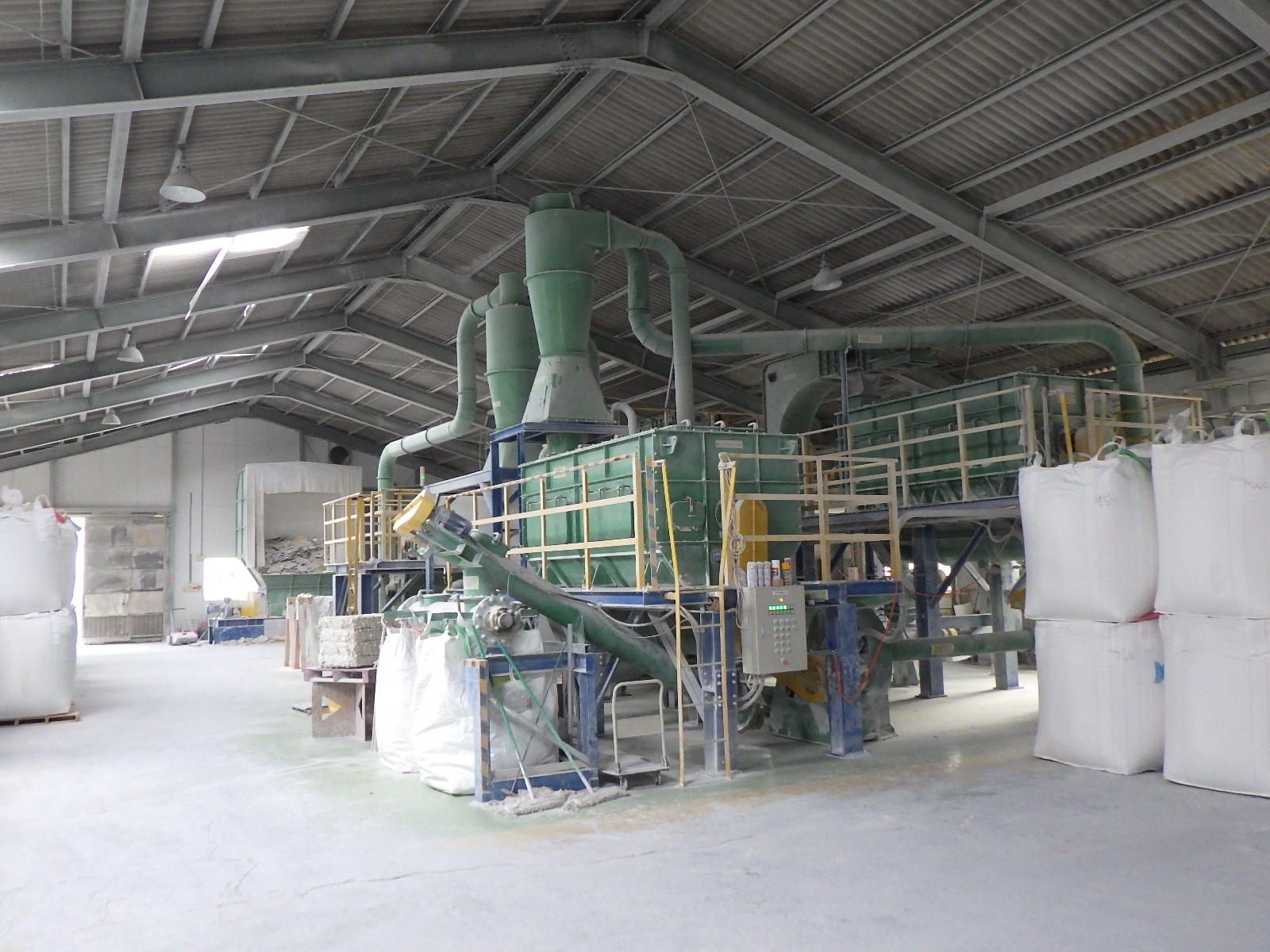 廃石膏ボードリサイクル/徳島県初の廃石膏ボードリサイクル設備です。国内最高水準のリサイクル技術を備えたシステムであり、完全屋内処理で大型集塵機も設置しており環境対策も万全です。